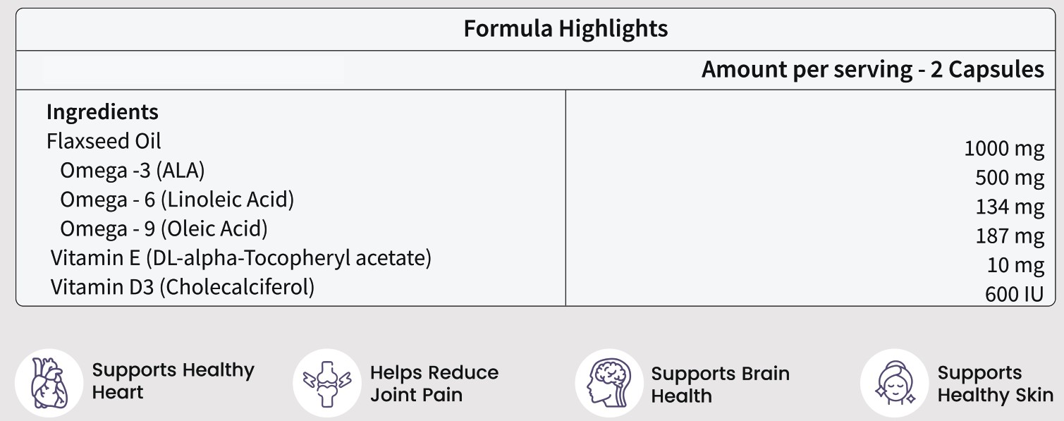 • Flaxseed Oil Capsule 1000mg For Heart- Complete care of omega 3, 6,9 helps manage total triglyceride & cholesterol levels in the body. With extra support of vitamin D3 it helps protect the heart.